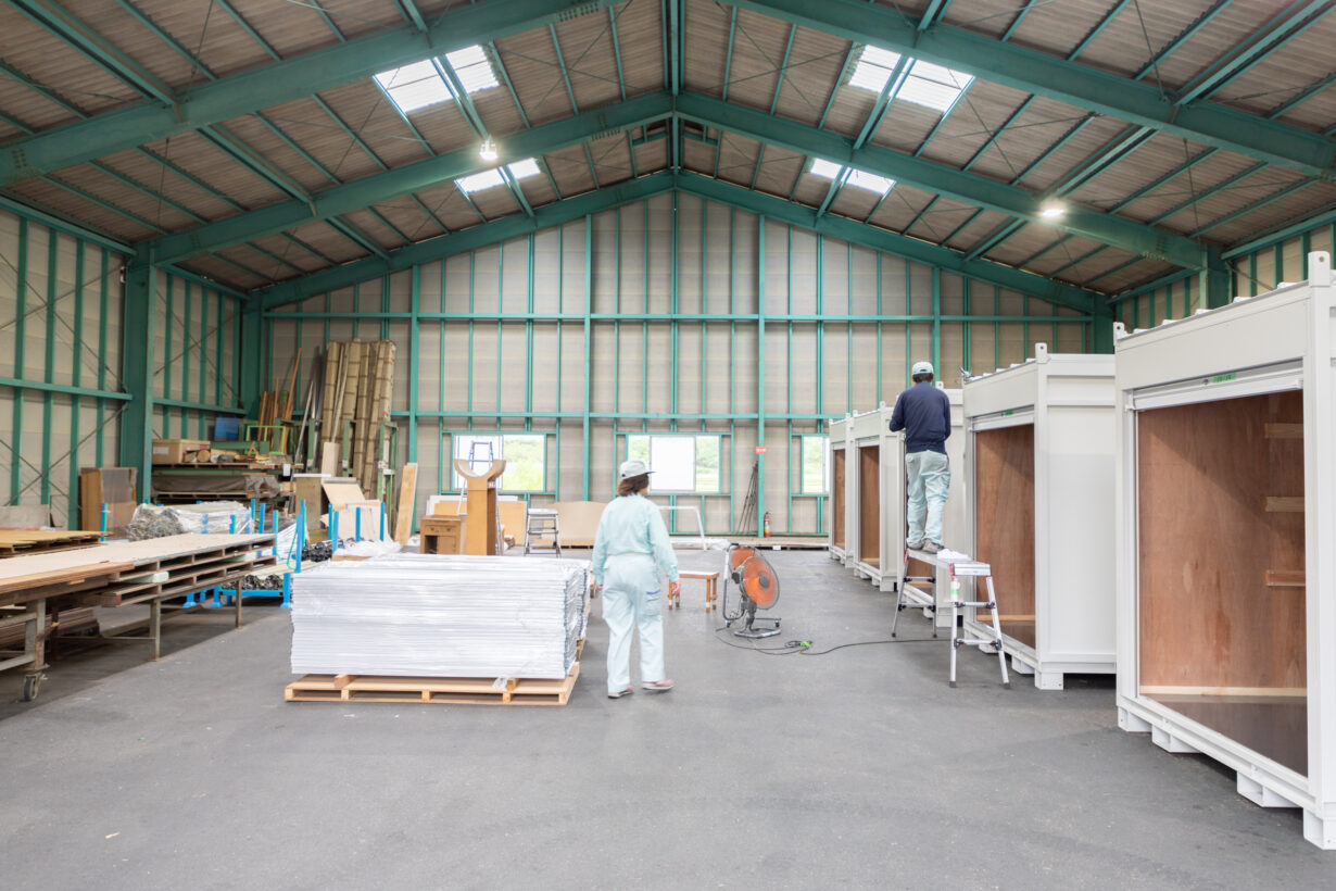 いいえ、災害時の仮設住宅の内装や設備工事に関しては、その地元の業者が行うと聞いています。私たちは仮設住宅一式を揃えているわけではなく、骨組み・壁・屋根など建物を造っています。