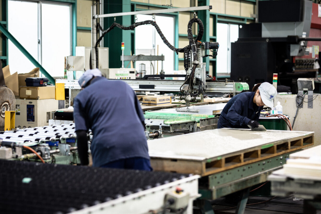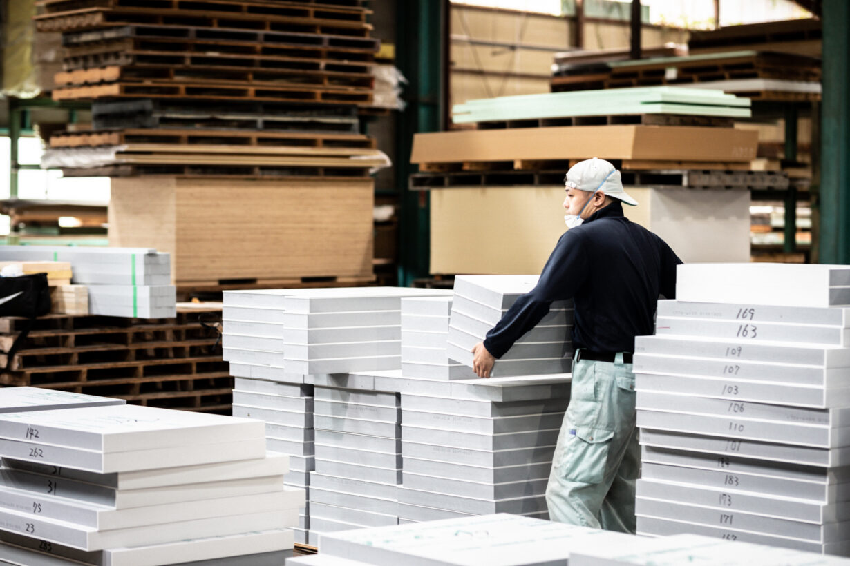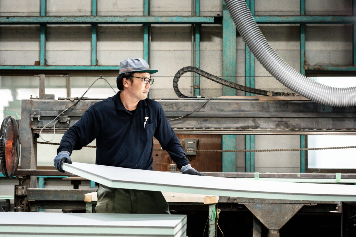 弊社は「あなたらしい快適な環境を創造する」という理念を掲げていて、具体的には断熱と防音のために、様々な建築材料を組み合わせた複合板(パネル)を製造しています。芯に断熱材を入れて両面に鉄板を組み合わせることで断熱パネルや、石膏ボードや化粧合板で防音パネルにしたりといった具合です。
