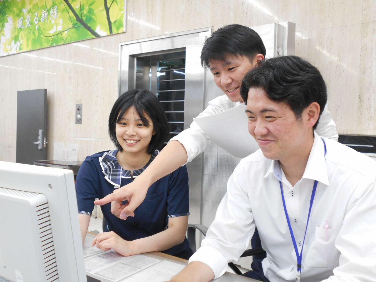 「なかしん」の店舗は、数名~10数名体制。気心知れたメンバーが、お互いサポートし合いながら仕事を進めています。みなさん、慣れるまで不安かもしれませんが、慣れるまで時間はかかりません。職員間の思いやりのある人間関係が、お客様との関係性を強くし、さらにお客様との温かい関係性にもつながっています。