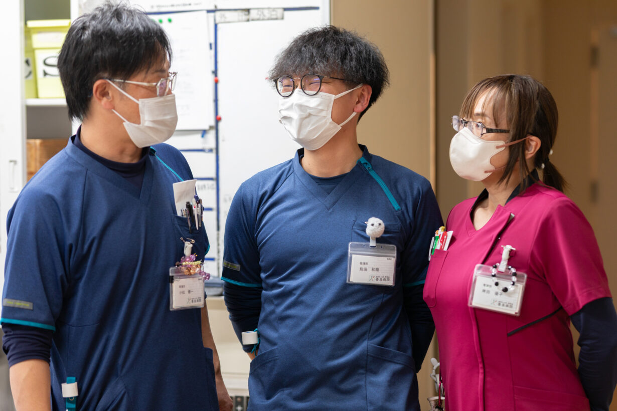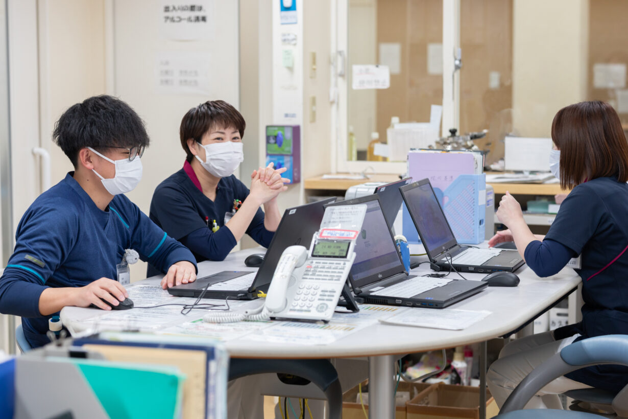 所属する三病棟は、入院されたばかりの患者さまを中心に約50人が入院されています。そこで看護師として、患者さまのバイタルサイン測定や服薬管理、医師の指示に基づく看護ケアを行っています。看護師1人あたり平均10名の患者さまを受け持ち、基本的には個々で動きながらも、その日のリーダーを中心としたチーム体制で連携しています。夜勤もありますが、夜勤明けは必ず休日となるため、安定した生活リズムで取り組めています。