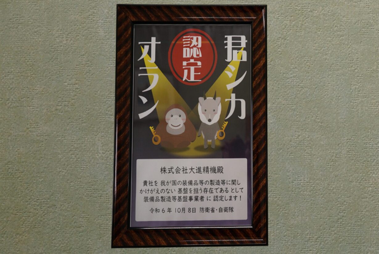 防衛省から、国の装備品等の製造を支える事業者として「君シカオラン認定」を受けておられます。