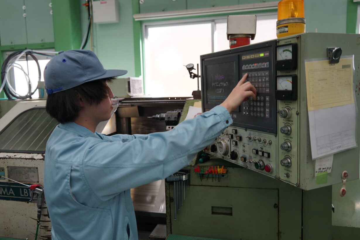 入社当初は、「汎用旋盤(はんようせんばん)」という自分の手でハンドルを操作して、感覚を頼りに金属を削る機械で経験を積みました。今は「NC旋盤(えぬしーせんばん)」というプログラムを組んで自動制御する機械を使った金属加工をしています。